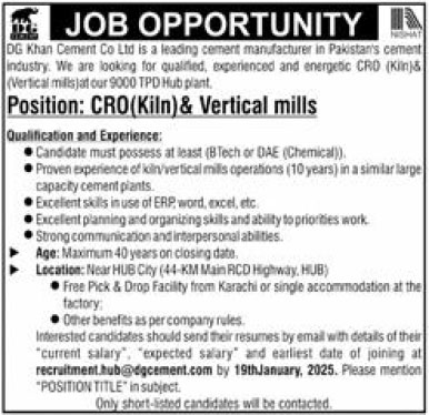 DG Khan Cement Co Ltd is a leading cement manufacturer in Pakistan’s cement industry. We are looking for qualified, experienced and energetic CRD (Kinj (Vertical mills at our 9000 TPD Hub plant.