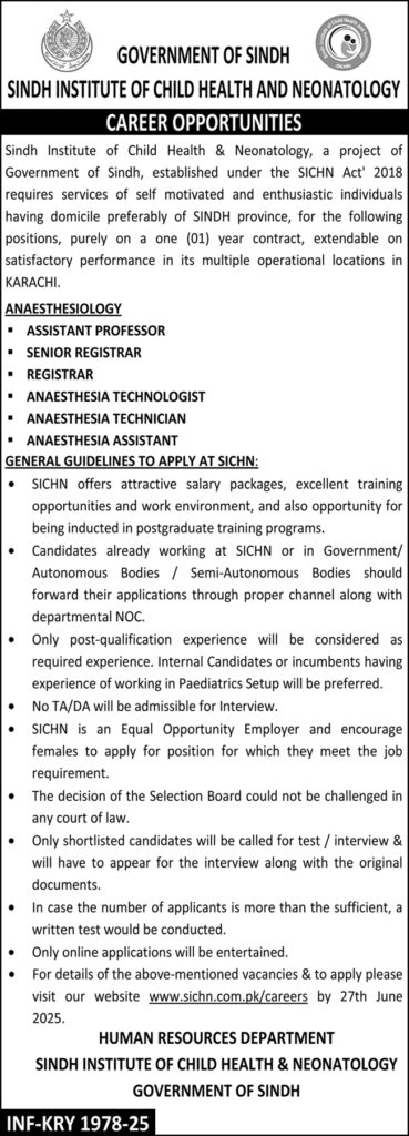 Sindh Institute of Child Health & Neonatology, a project of Government of Sindh, established under the SICHN Act’ 2018 requires services of self motivated and enthusiastic individuals having domicile preferably of SINDH province, for the following positions, purely on a one (01) year contract, extendable on satisfactory performance in its multiple operational locations in KARACHI.