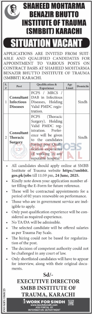 • All candidates should apply online at SMBB Institute of Trauma website https://smbbit.gos.pk/jobs till 11:59 pm, 24 June, 2025.