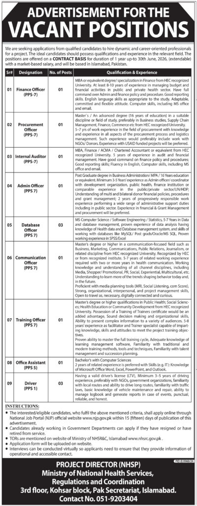 | 01 | Finance Officer (PPS-7) | 01 | MBA or equivalent degree/ specialization in Finance from HEC recognized University. At least 8-10 years of experience in managing budget and financial activities in public and private health sector. Have full command over Admin and finance policy and procedure. Good reporting skills. English language skills as appropriate to the study. Adaptable, committed and flexible attitude. Computer skills, including MS office and email. |