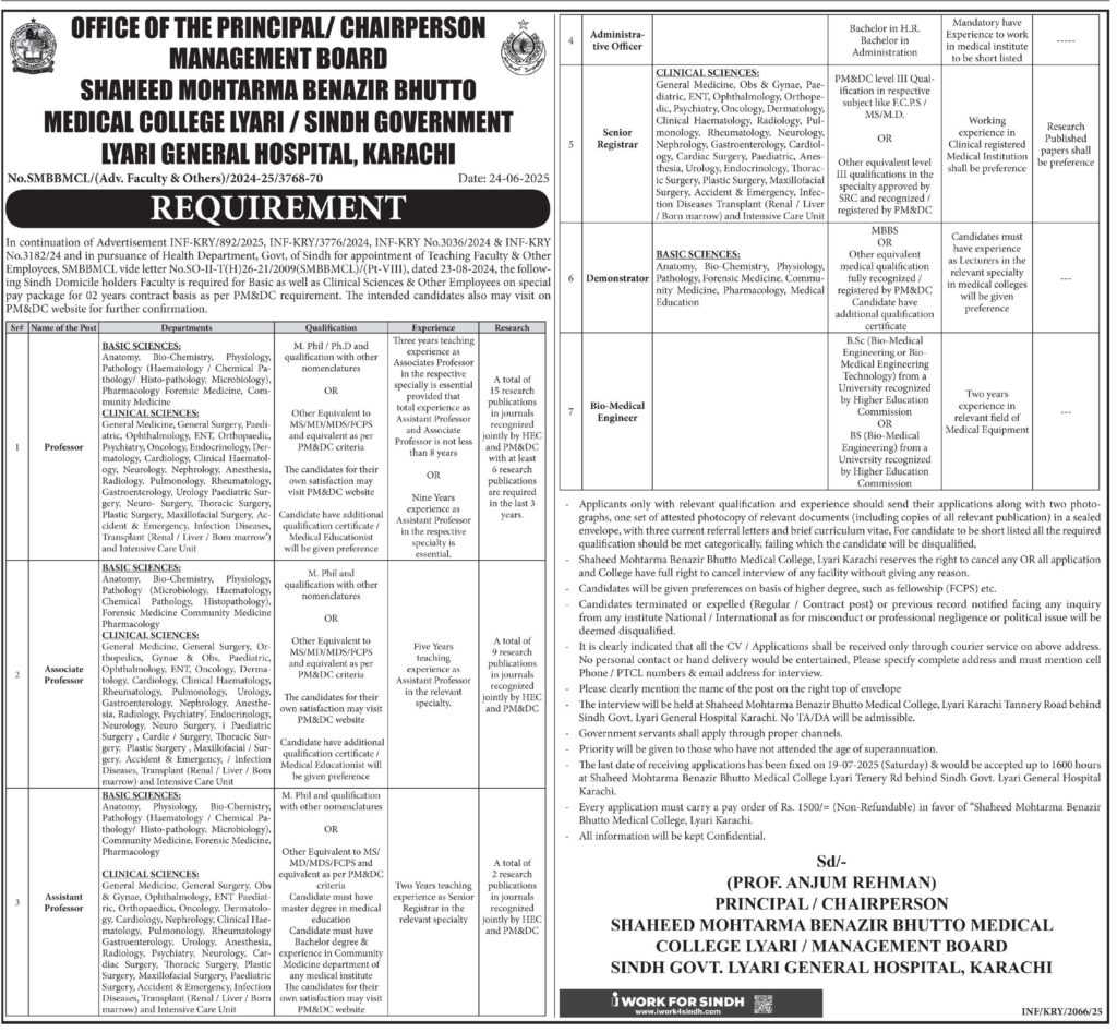 1ProfessorBASIC SCIENCES: Anatomy, Bio-Chemistry, Physiology, Pathology (Histopathology, Chemical Pathology, Hematology, Microbiology), Pharmacology, Forensic Medicine, Community Medicine CLINICAL SCIENCES: General Medicine, General Surgery, Paediatrics, Ophthalmology, ENT, Orthopaedics, Psychiatry, Oncology, Endocrinology, Dermatology, Cardiology, Clinical Haematology, Nephrology, Neurosurgery, Anaesthesia, Radiology, Pulmonology, Rheumatology, Gastroenterology, Urology, Paediatric Surgery, Neuro Surgery, Thoracic Surgery, Plastic Surgery, Maxillofacial Surgery, Accident & Emergency, Infection Diseases, Organ Transplant (Heart / Liver / Bone marrow) and Intensive Care Uniti. PhD / Phil and equivalent qualification with other nomenclatures as approved by HEC and PM&DC criteria OR MBBS or Equivalent to M.S/MD/MDS/FCPS and equivalent as per PM&DC criteria. The candidates for their own satisfaction are advised to ensure that their qualification certificate of Medical Education will be pre screenedi. 3 Years experience as Associate Professor is required to be appointed as Professor especially if appointed at the same level in the past. Experience as Assistant Professor or in any other position will not be considered. Nine Years Teaching experience as Assistant Professor is essentialA total of 15 research publications in journals recognized by HEC and PM&DC with at least 6 research publications are required in the last 3 years.
