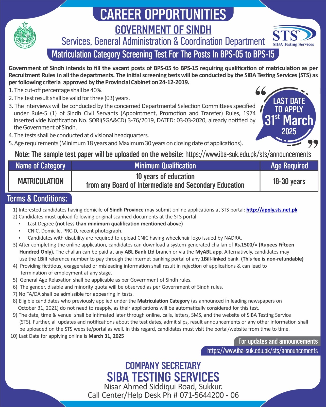 Government of Sindh intends to fill the vacant posts of BPS-05 to BPS-15 requiring qualification of matriculation as per Recruitment Rules in all the departments. The initial screening tests will be conducted by the SIBA Testing Services (STS) as per following criteria approved by the Provincial Cabinet on 24-12-2019.