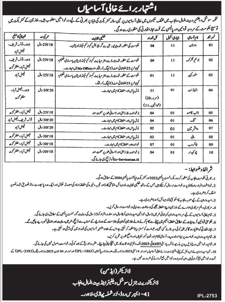 محکمہ سوشل ویلفسیر و بیت المال، پنجاب میں مختلف سکیموں میں خالی آسامیوں پر تین سالہ کنٹریکٹ کی بنیاد پر بھرتی کے لیے درخواستیں مطلوب ہیں۔ ملازمین کے کنٹریکٹ میں توسیع حکومت کے مروجہ قوانین اور پالیسی کے تحت مجاز اتھارٹی کی منظوری سے ہوگی۔